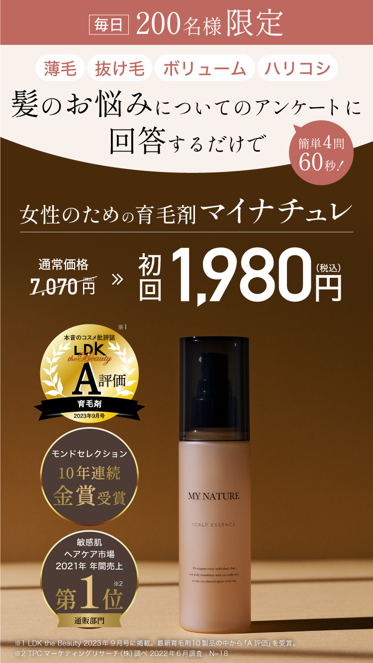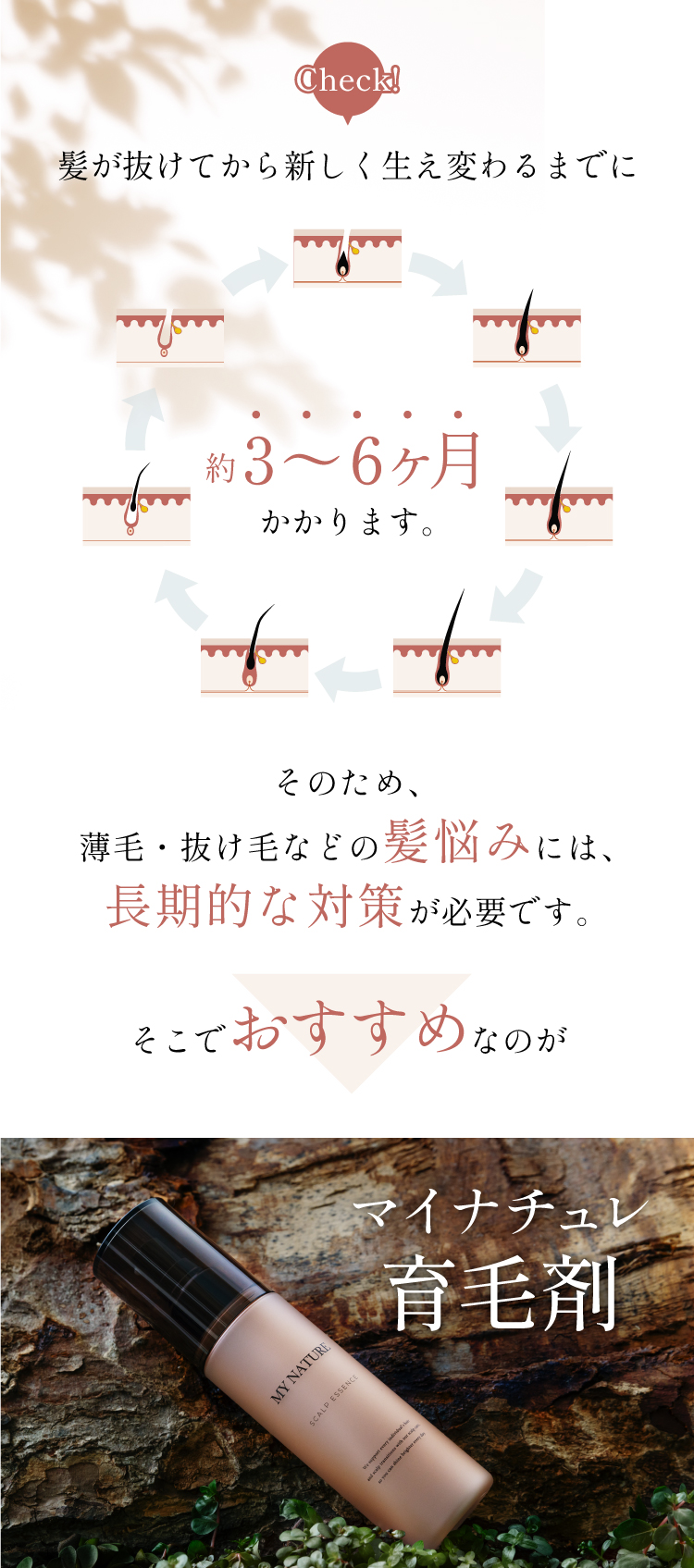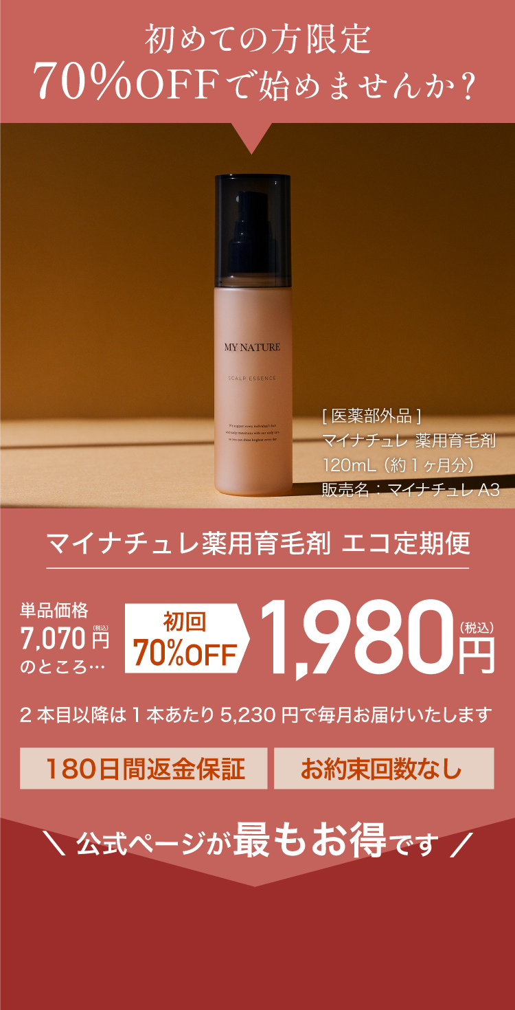 ただし、頭皮環境を整え、育毛・発毛を促進するためにも、まずは半年1ヵ月1本のペースでご利用いただくことをおすすめいたします。ご希望の際には商品ご注文後にマイナチュレお問い合わせページよりご連絡ください。