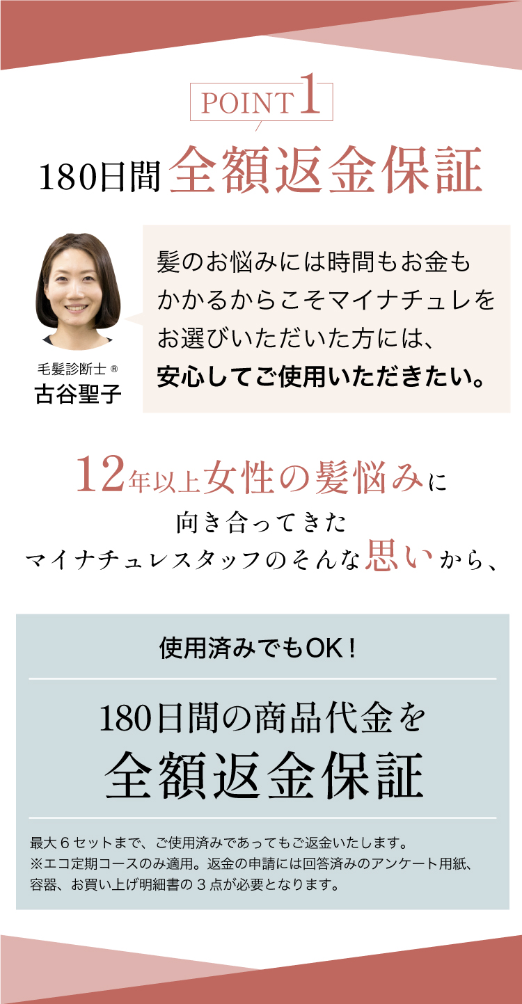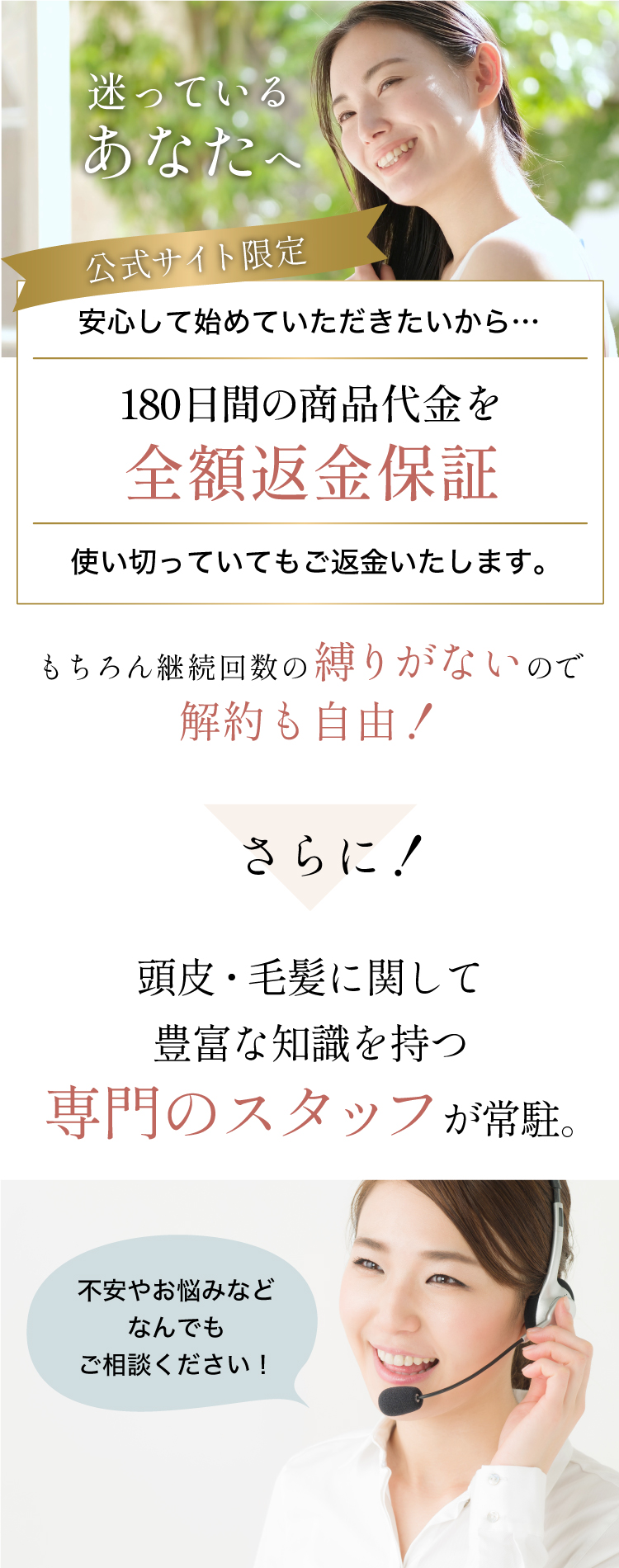定期コースをご注文のお客様限定で、商品にご満足頂けない場合は商品代金をお返し致します(定期コース初回注文日より180日以内上限6本。送料はお客様ご負担、使用済み可、1世帯につき1回のみ)