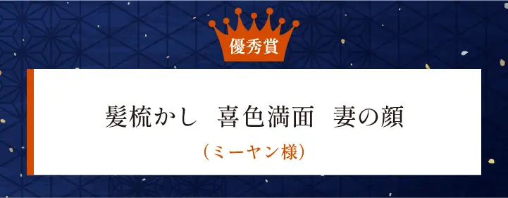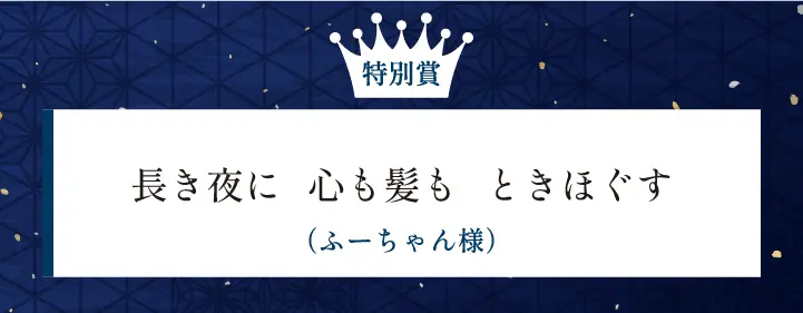 日々のケアの中に生まれる幸福の瞬間を見事に切り取った一句。髪が整うことで心まで晴れやかになる——その喜びが生き生きと伝わってきます。大切な人の笑顔を通して、髪をいたわる時間の尊さを改めて感じさせてくれました。(瀧澤)