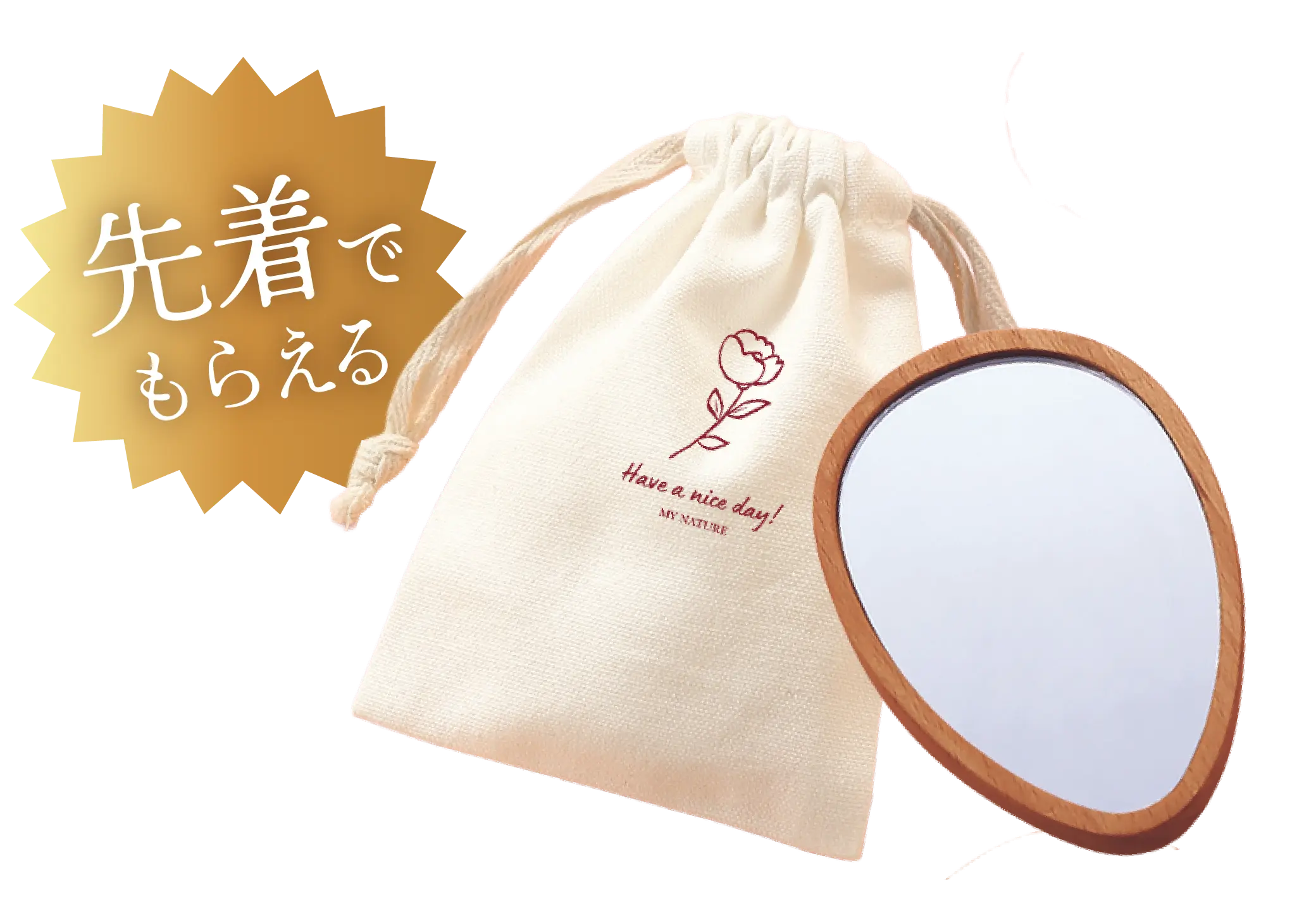 先着50名様限定ノベルティプレゼント(コンパクトミラー&ミニ巾着袋セット)木製の優しい素材感ところんとした形が可愛いコンパクトミラーと、やさしさや夢、希望を象徴するポピーと “have a nice day!” を添えた巾着袋です。